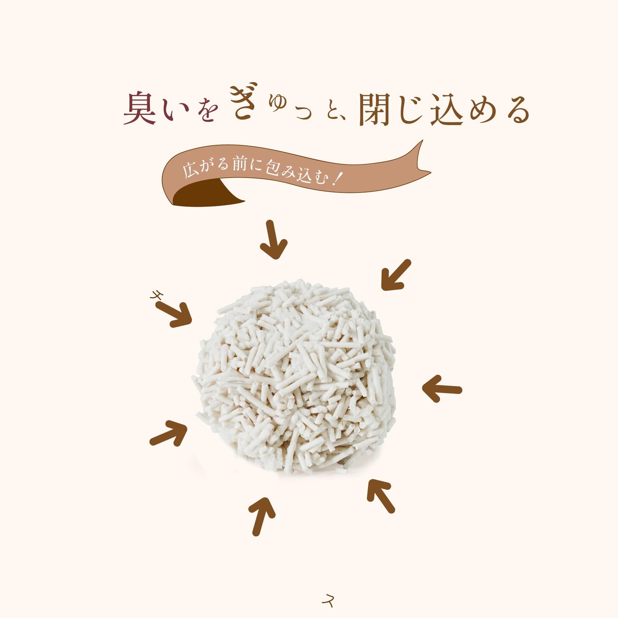 植物繊維とデンプンの粘着力で尿を素早く吸収し、嫌な臭いを広げる前に封じ込めます。