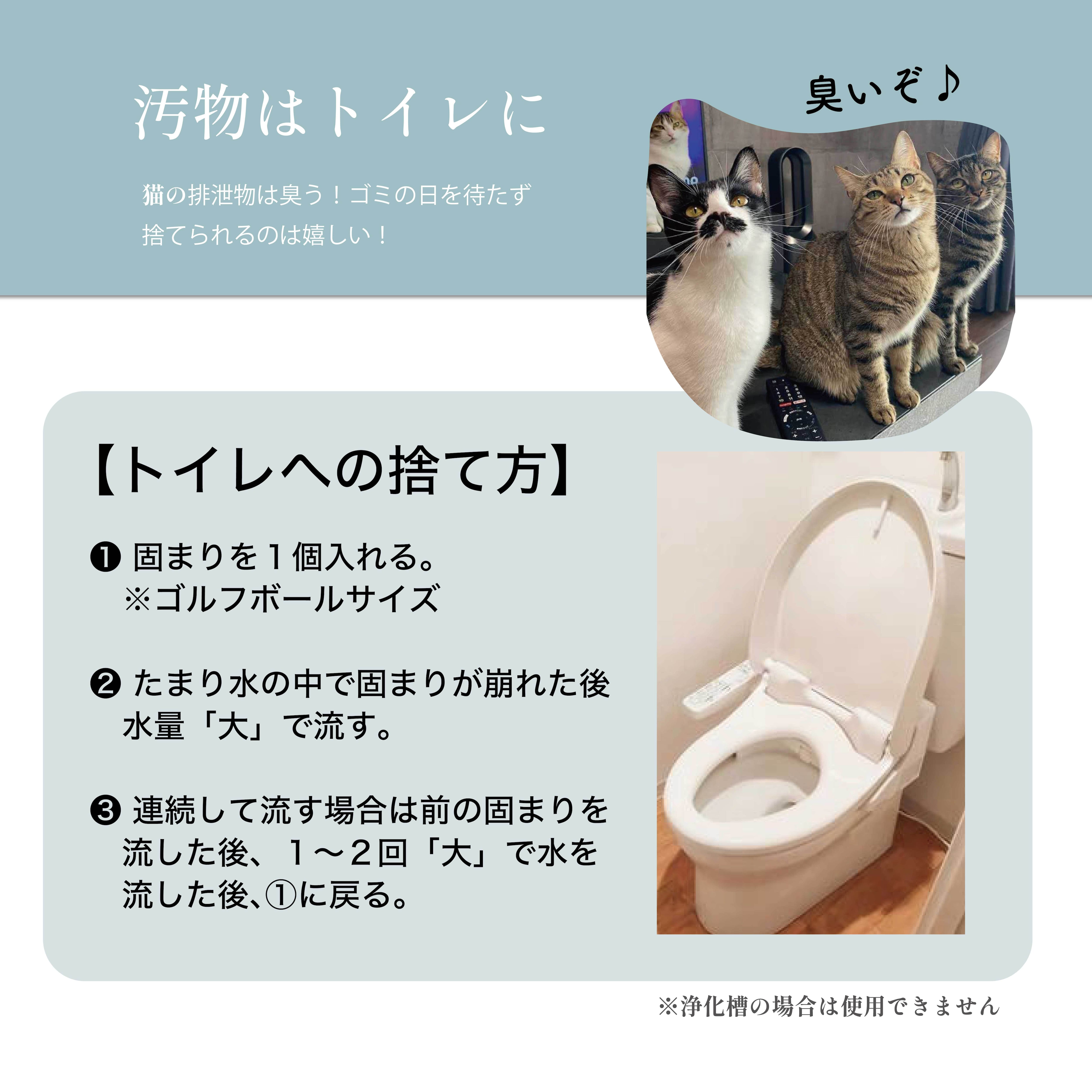 ・本お試しパックはトイレ全面をカバーできる量ではありません。現在ご使用の猫砂の一部を置き換えていただくか、小さなトレイに入れてお試しください。